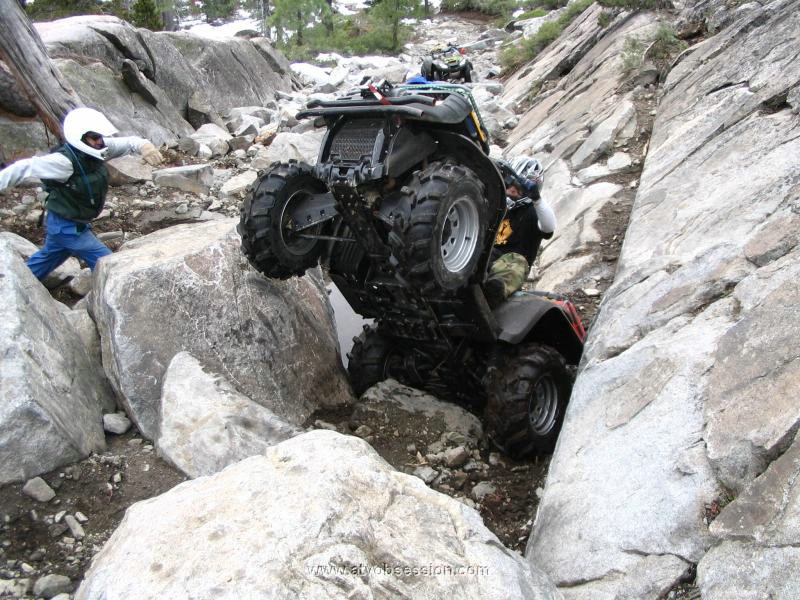 Last weekend 8 of the ATV Obsession gang went from Loon Lake to Buck Island Lake, setup camp, then rode to the Rubicon Springs and back to Buck Island Lake in one day. The next day we did the Rubicon backwards, back to Loon Lake. We had an awesome time, but also some scary moments as 6 of the ATV's rolled over and one guy...Larry, drove off the trail and had to be winched back onto the road. It was a treacherous trail, but nobody was hurt. One of the members, Dan is 60 years young and one our members is my wife. You don't see many guys out there doing this...and you certainly don't see many females rock crawling. We venture to bet the list of women that have rode an ATV frontwards and Backwards through the Rubicon is a pretty small list. Check out the photo and video section for 124 awesome pictures! I have it setup on Slide Show mode...use the Stop/Start anytime you want. |
