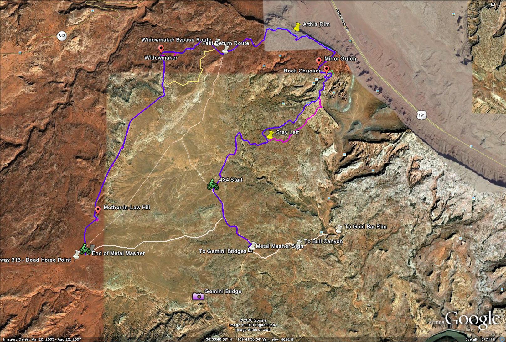 Description: Metal Masher. One of my favorites. It has 2 extreme obstacles, Rock Chucker and Widowmaker. However, both of them have bypasses, making this trail intermediate overall. It has a great view in the middle overlooking 191, and after you finish you're a short ride to Gemini Bridges. The KMZ contains our tracks from 2007 and 2010. |