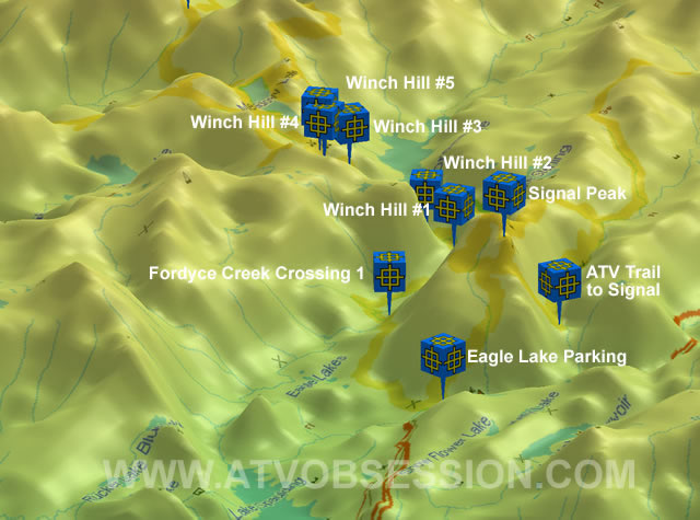 These are some of the trails we've taken. All waypoints and Trail Tracks were taken using a Magellan Sport Trak Pro GPS. All 2D and 3D Map shots were used using Magellan Mapsend Topo 3D. Earth shots are used using Google Earth Plus. |